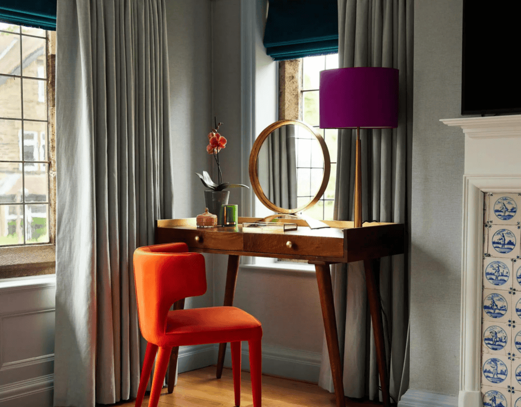 The small, round mirror enhances the feeling of space and bounces the light around, and the sleek orange chair complements the blues on the walls and woodwork and the wooden tones, which contrasts beautifully against the textiles and fireplace tiles.